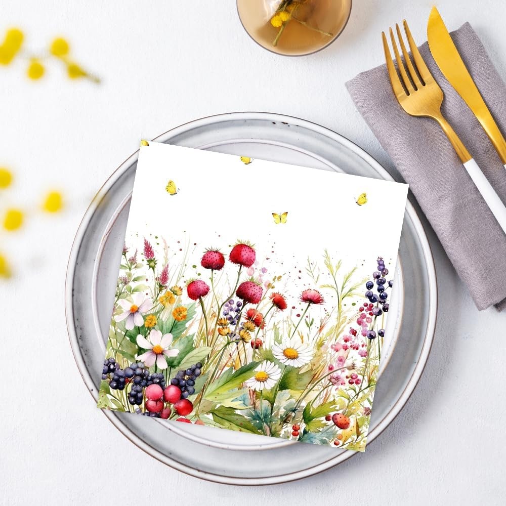 20x Sommer Servietten / Blumen Schmetterlinge Beeren - Rot grün - Geburtstag