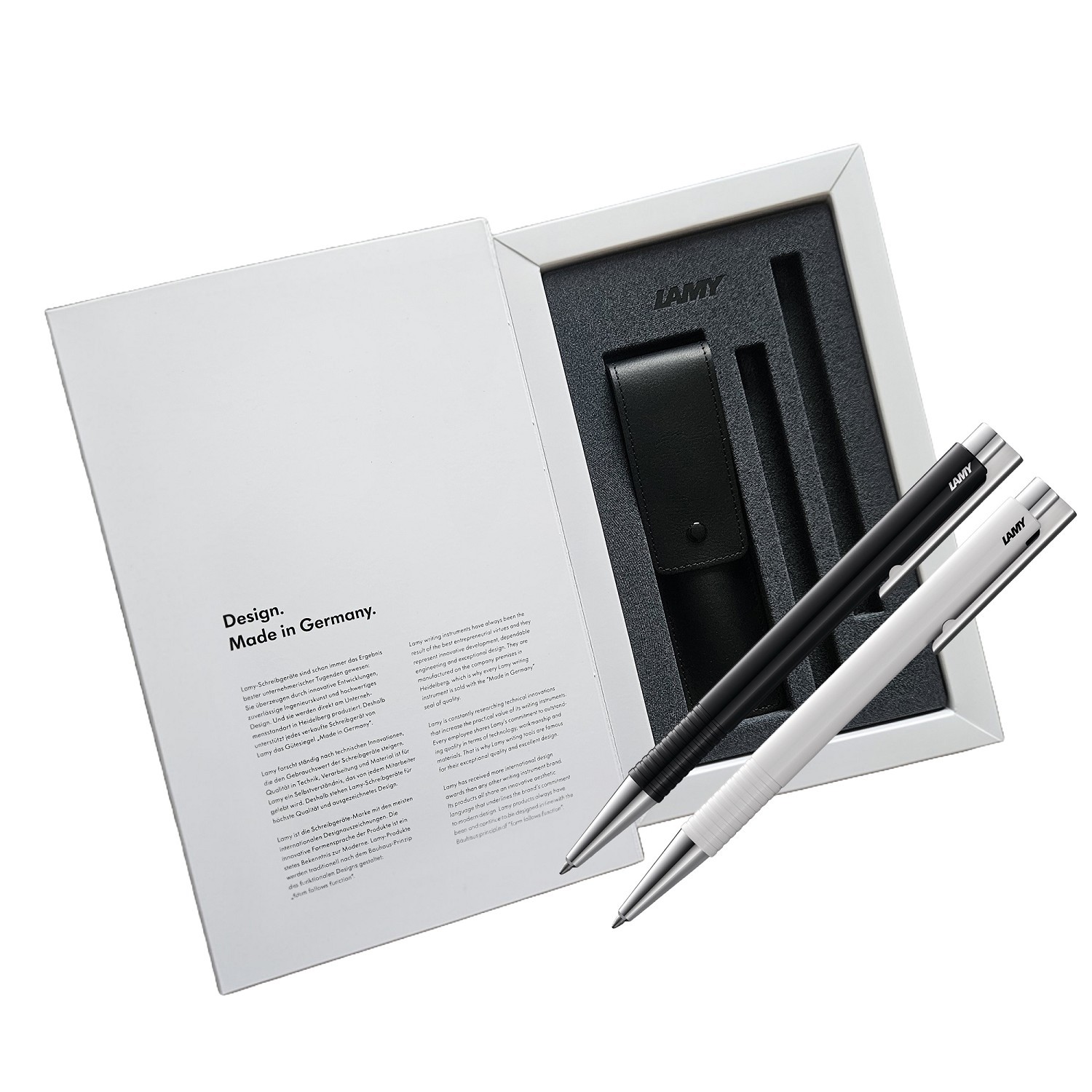 LAMY Logo Kugelschreiber schwarz + weiß – 2 Kugelschreiber + Leder Etui für 2 Schreibgeräte– SET