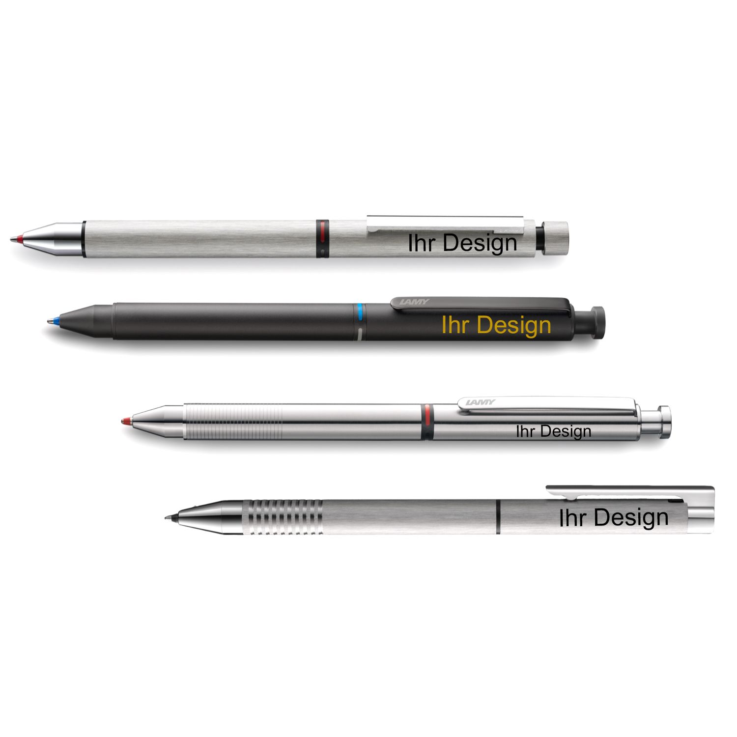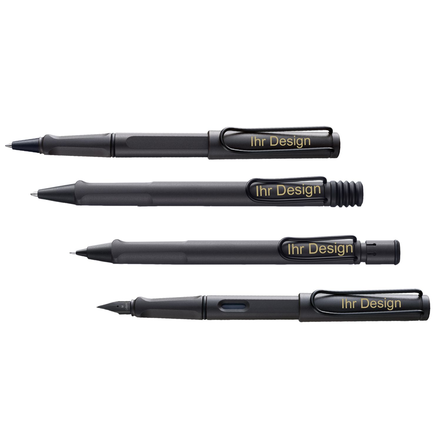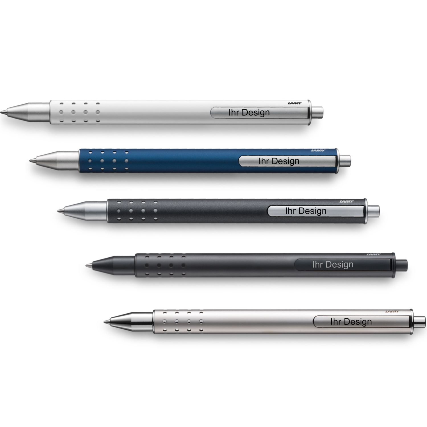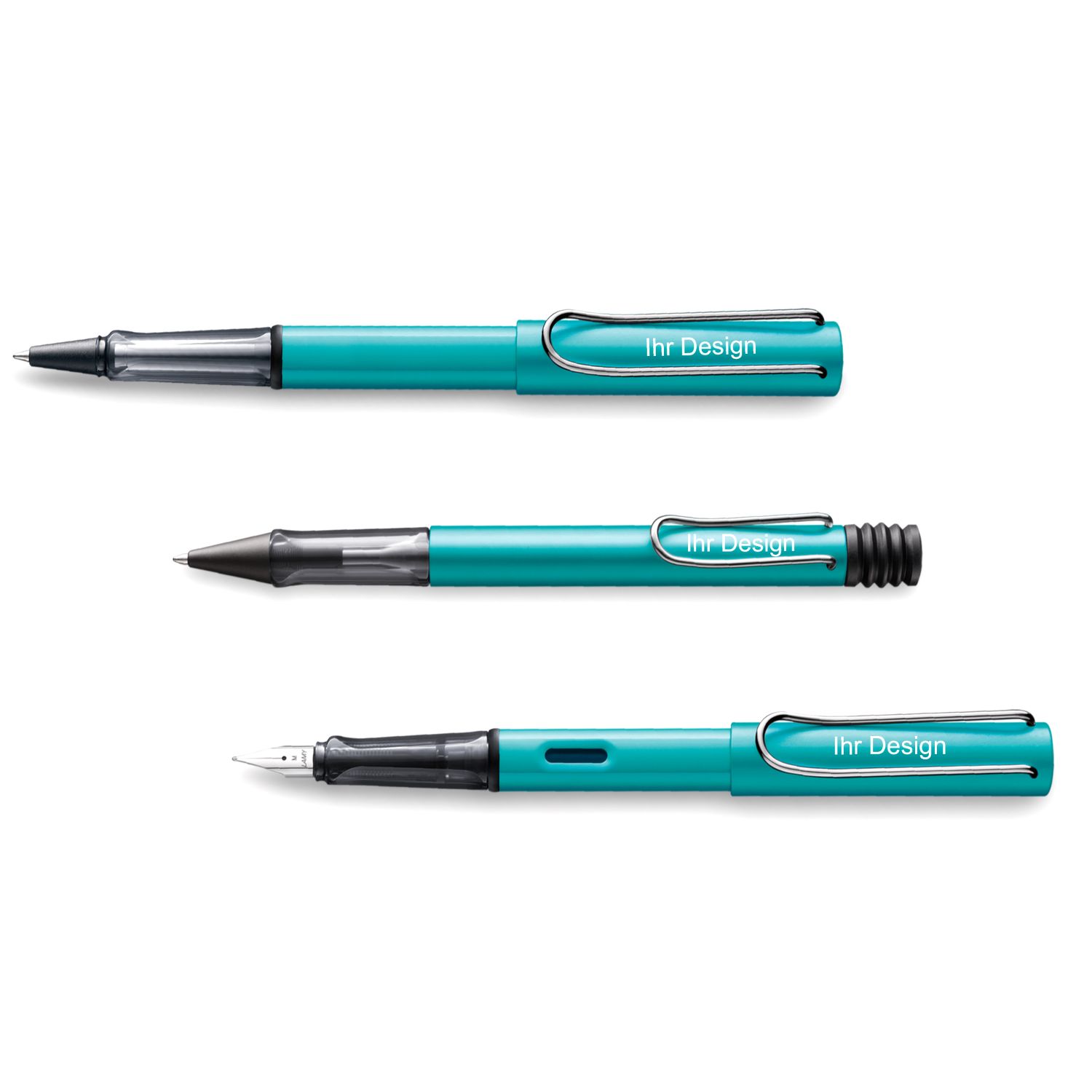 - Bei Schreibgeräten mit einem Clip, wird sich die Gravur je Ausrichtung (Rechts-/ Linkshänder) unterhalb oder oberhalb des Clips befinden, sodass sich die Gravur am Lamy-Logo anpasst.