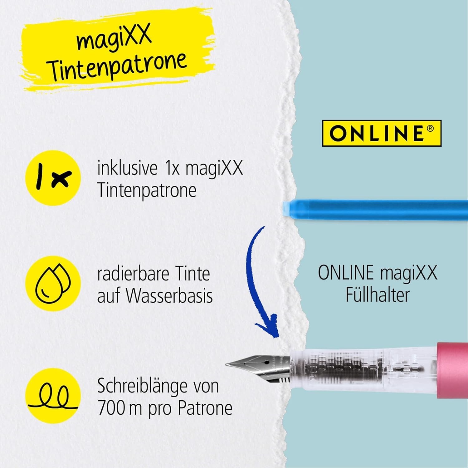 Produktinformationen "Radierbarer Füller für Schule - MagiXX Rosa/Silber + Patrone blau - Online - sweet love"