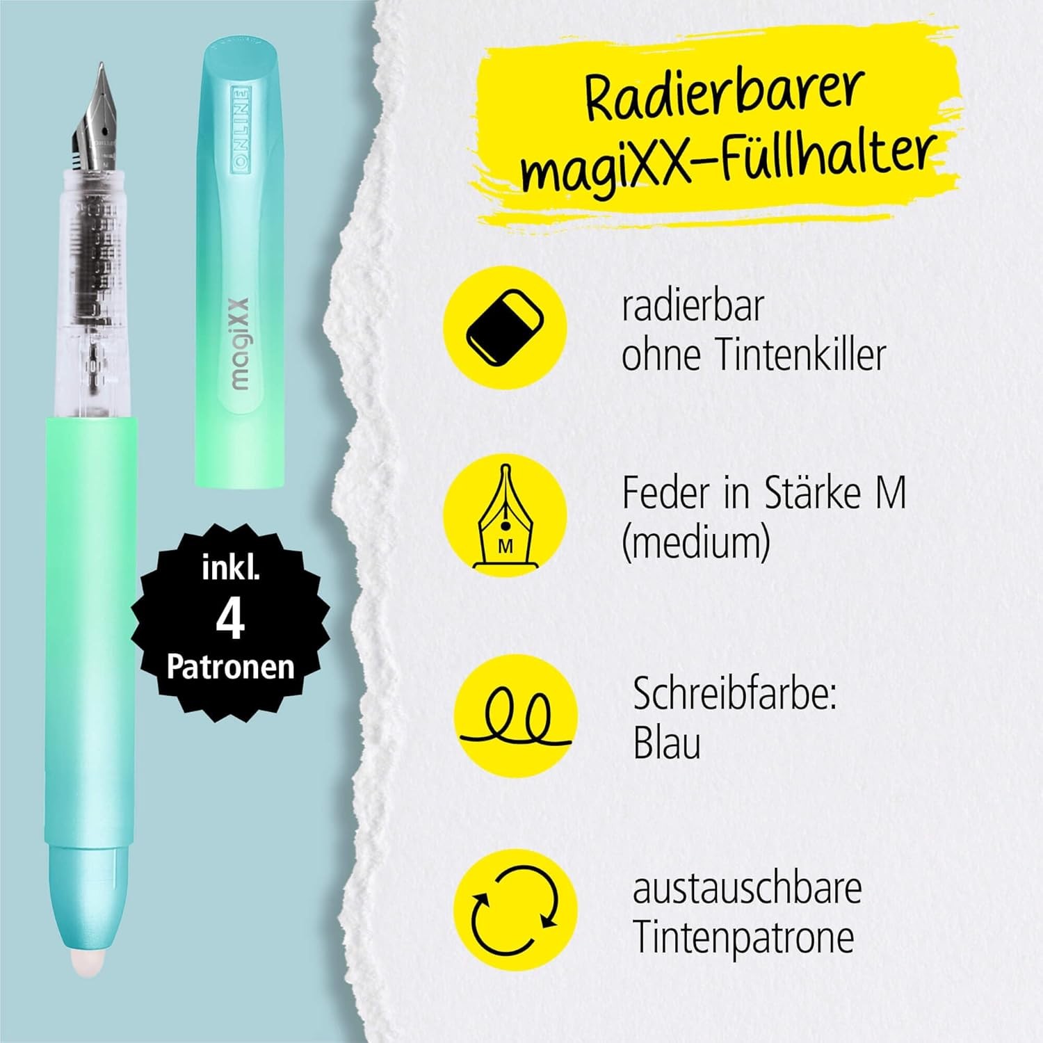 Produktinformationen "Radierbarer Füller für Schule - MagiXX Türkis/Silber + 4 Patronen blau Online - turquoise dreams"